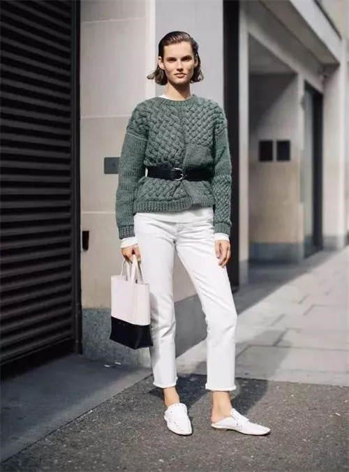 这一套黑白灰的搭配很和适合休闲时穿着,炭灰色毛衣外套+白色裤子与黑白拼接包包,需要增加时尚度或者呈现自己的风格,就加上适合自己宽度的腰带吧。