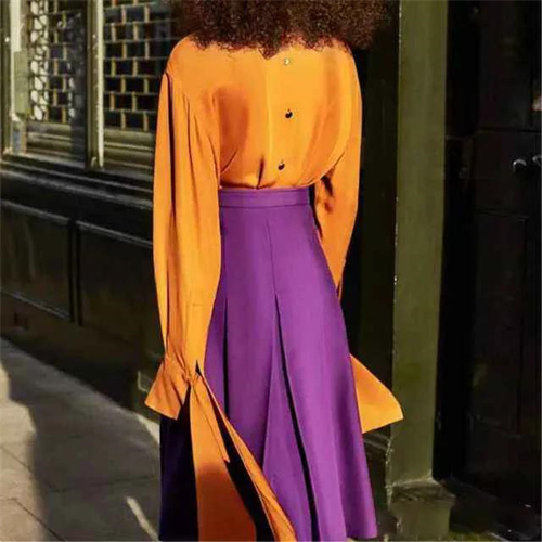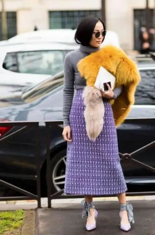紫色家族会是接下来大热的色系,紫色控们除了不要错过上面的紫配绿,也不要错过这紫配橙。紫配橙给人一种热情又浪漫的感觉,非常适合作为春节打破常规、让人眼前一亮的穿搭。