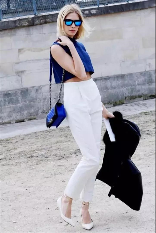 这个蓝接近我们常说的正蓝色,明度较低,饱和度高,首选深冷型、冷亮型、净冷型人穿,很适合经典的黑白配色,高冷大气,或作夜配色。