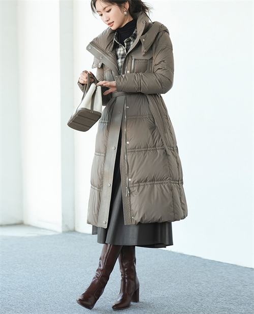 收腰羽绒服可搭配有垂坠感的裤子以及包脚型的鞋子,加上适当的配饰,女人味就出来了。