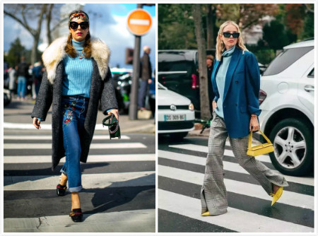 像下面↓这一身配色放现在穿,绝了,把2020年度流行色经典蓝和来年的流行色串联起来。