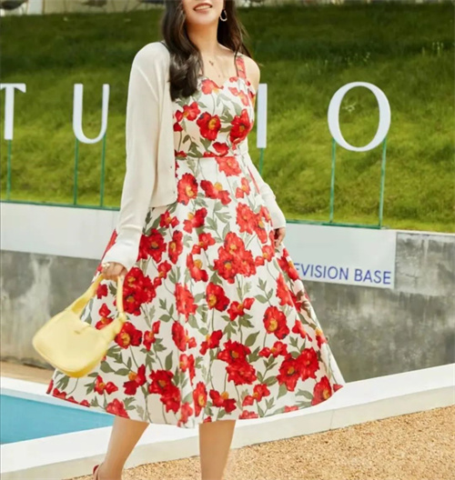 十一长假要到了,给自己选条度假的花裙子吧。很多人认为胖人不可以穿大花,会很繁复显得更胖,其实不是的。浪漫型人穿就完全没有问题。下面这条红花连衣裙,方领显瘦,外面搭一件小开衫,遮肉又轻盈。