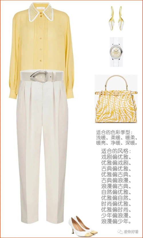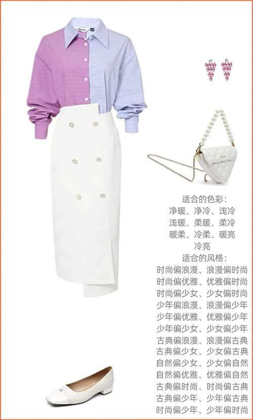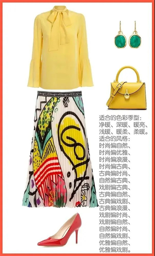 或者是基本款的衬衫搭配花纹出挑的半身裙,而且颜色是下上有呼应的。一般就是上花下素、上素下花的搭配,不要一身花纹搭配花纹,不适合职场。