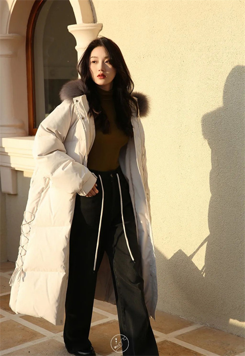 一身浅色系搭配,阔腿裤搭配上厚实的米白色长款羽绒服,不会显得拖沓累赘,反而给我们一种清爽慵懒的感觉,去哈尔滨的话可以搭配亮色的围巾、帽子,裤子选厚实一些。