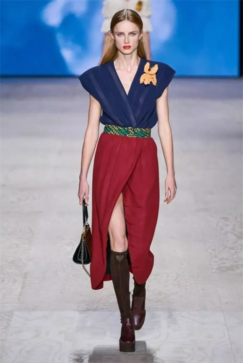 红色是华伦天奴的标签,但再桀骜的红也要屈服于古典风格的高贵和典雅之下,端庄、雅致、贵气的设计要素成就了古典型的衣服特点,古典的设计让原本最热烈的红也有了些许距离感。
